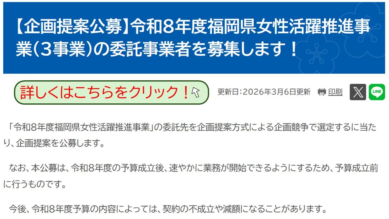 【企画提案公募】令和8年度福岡県女性活躍推進事業(3事業)の委託事業者を募集します!