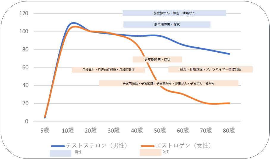 参考文献:厚生労働省、働く女性の健康支援事業 事務局、働く女性の心とカラダの応援サイト、内閣府、男女共同参画局、男女共同参画白書、 I-特-34図 男性・女性ホルモンの推移
