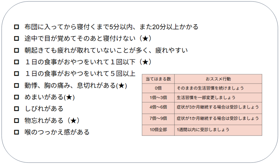 チェックがついた項目の数や内容にあわせて、下のピンクの欄を参考に、ご自身の「いまの状態」をセルフチェックしてみてください。