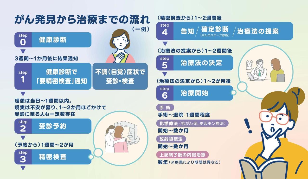 健康診断をきっかけに見つかるケースも多く、精密検査、告知(確定診断)、治療法の提案と、いくつかの段階を経て進みます。